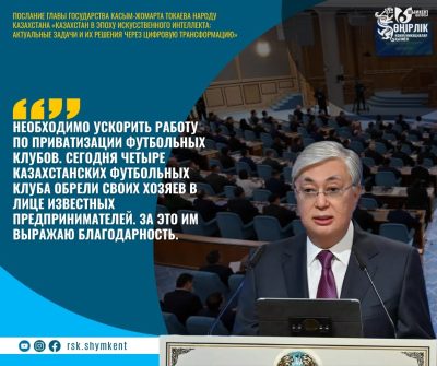 Президент Республики Казахстан Касым-Жомарт Токаев в Послании от 8 сентября 2025 года подчеркнул важность ускорения процесса приватизации футбольных клубов с ...Мемлекет басшысының Жарлығымен Қазақстан Республикасы ішкі саясатының негізгі қағидаттары, құндылықтары мен бағыттары бекітілді