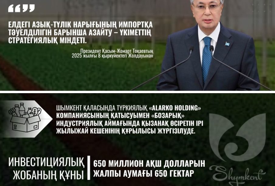 Қазақстан Республикасының Президенті Қасым-Жомарт Тоқаев 2025 жылғы 8 қыркүйектегі Жолдауында азық-түлік қауіпсіздігін қамтамасыз ету және ішкі нарықтың импортқа тәуелділігін азайту Үкіметтің стратегиялық міндеті екенін атап өтті. Осы бағыттағы ірі жобалардың бірі ретінде Шымкент қаласында «Бозарық» индустриялық аймағында жылыжай кешенінің құрылысы жүзеге асырылуда.